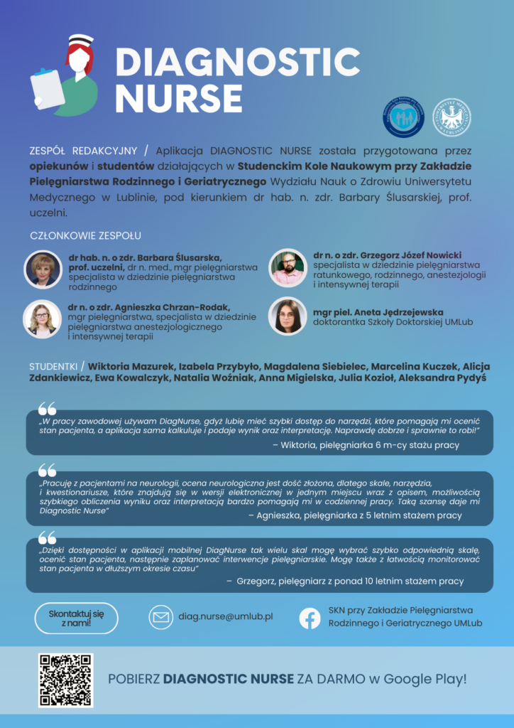 Aplikacja mobilna DiagNurse została przygotowana przez opiekunów i studentów działających w Studenckim Kole Naukowym przy Zakładzie Pielęgniarstwa Rodzinnego i Geriatrycznego, Wydziału Nauk o Zdrowiu, Uniwersytetu Medycznego w Lublinie.