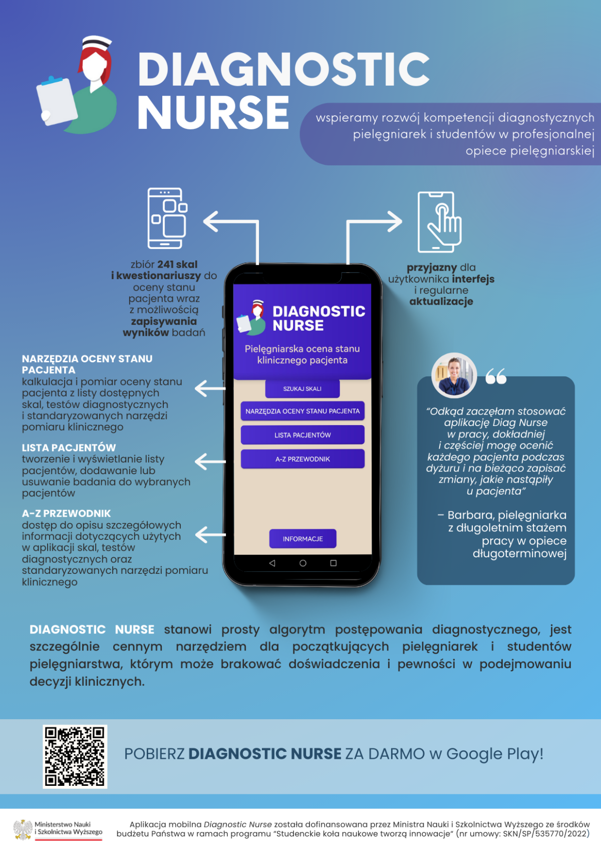 Aplikacja mobilna DiagNurse została przygotowana przez opiekunów i studentów działających w Studenckim Kole Naukowym przy Zakładzie Pielęgniarstwa Rodzinnego i Geriatrycznego, Wydziału Nauk o Zdrowiu, Uniwersytetu Medycznego w Lublinie.